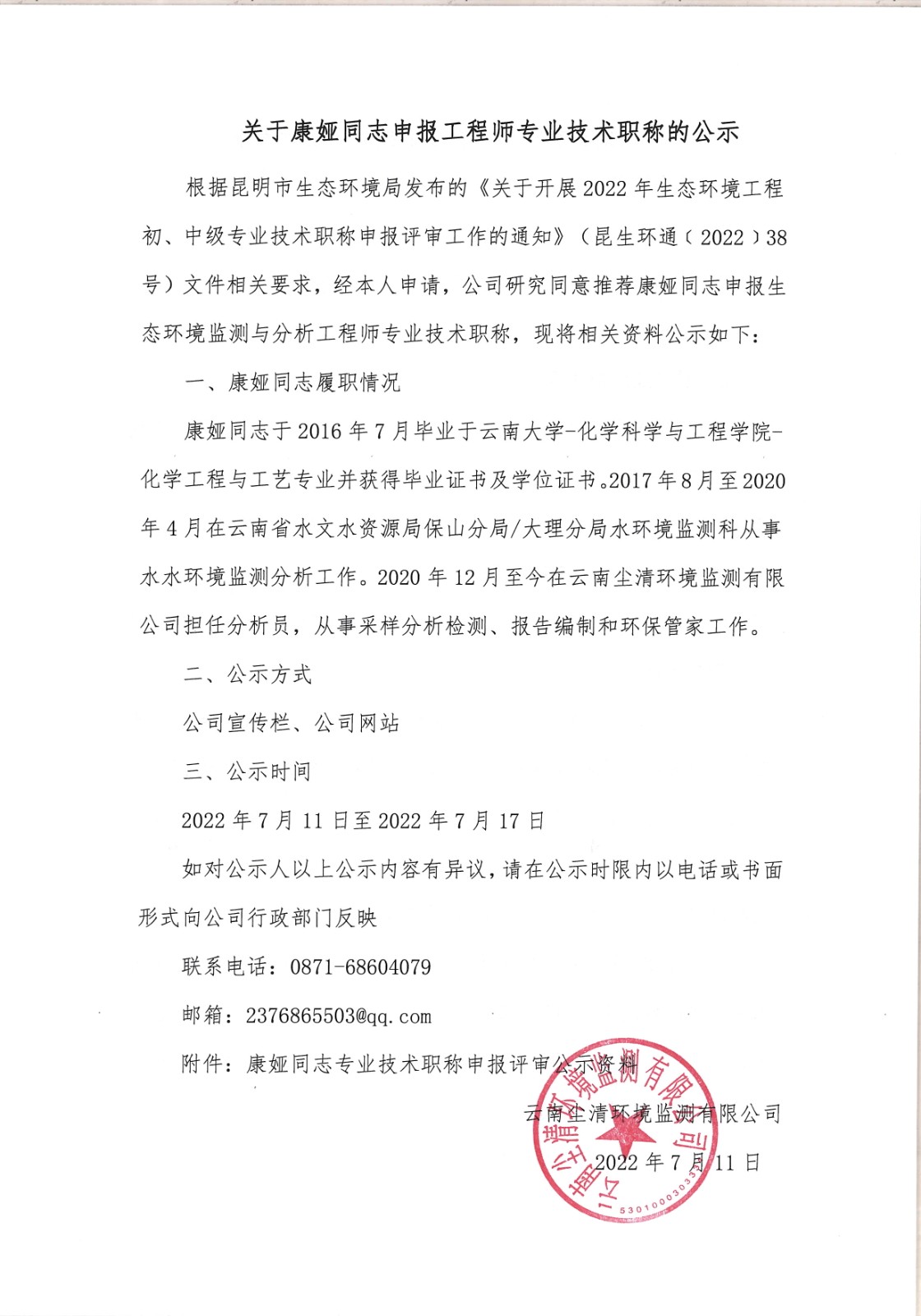 關于康婭同志申報工程師專業技術職稱的公示(公示時間:2022年7月11日至7月17日)